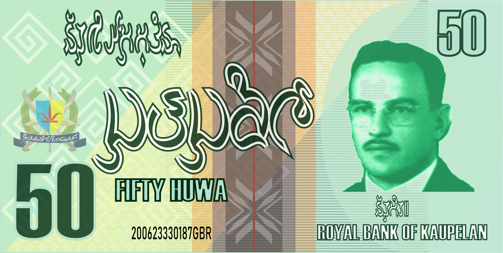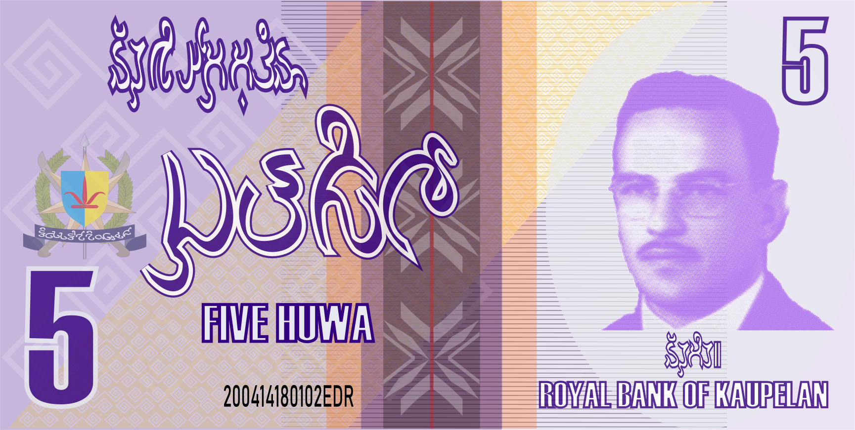 The Kaupelanese currency was established in 1960 as Kaupelanese rupee (rupya kaupèlan). In 1974, the rupee was replaced by the Kaupelanese huwa (huwa kaupèlan) at the rate of 1,000 rupees per 1 huwa. In 2005 and in 2020, new banknotes of 5, 10, 20, 50, 100 and 200 huwa were issued. Huwa is divided in 100 hiyatus. There are coins of 10, 20, 50 hiyatus and 1 and 2 huwas.